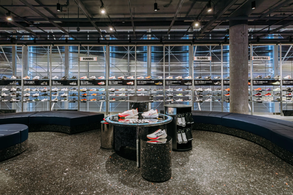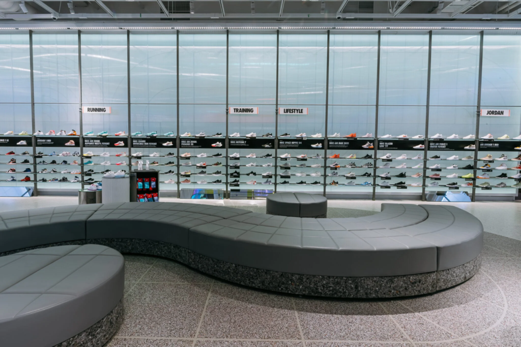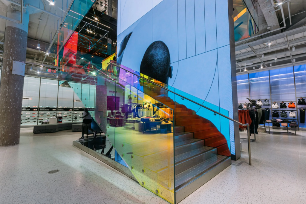 Feature wall with primary structure in modular 4”x4” HSS frames anchored to base building concrete floor slab with site-leveled base plates and secured to base building ceiling blocking with custom slip-connection. Secondary structure in modular 1”x1” HSS frames secured to primary structure with brackets and mechanical fasteners. Product side with translucent white polycarbonate panels fastened to primary structure with custom brackets. Immersive Experience face in LED video tiles with 2.6mm pixel pitch. Feature staricase, approximately 29’Lx15’Wx24’H, with two flights of stairs and one floating landing. Staircase and landing structure in steel w-profile stringers, with welded HSS cross members, treads and risers structure in brake formed steel plate, structure secured to base building concrete floor slab in product zone and base building concreet floor slab in second floor – all connections verified by base building engineer. This project was carried out under the executive leadership of our team during their prior employment and is not directly associated with Bauvik inc.